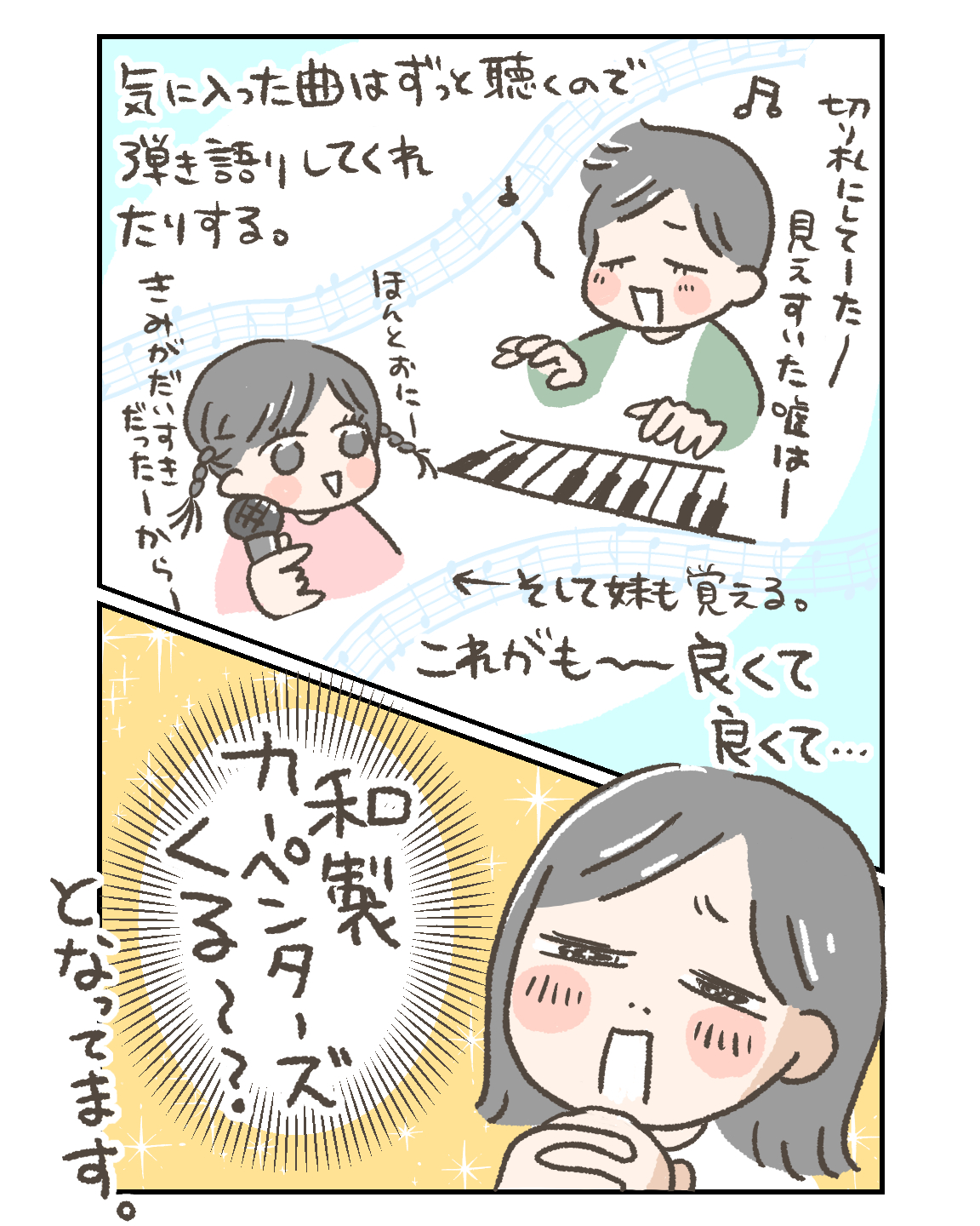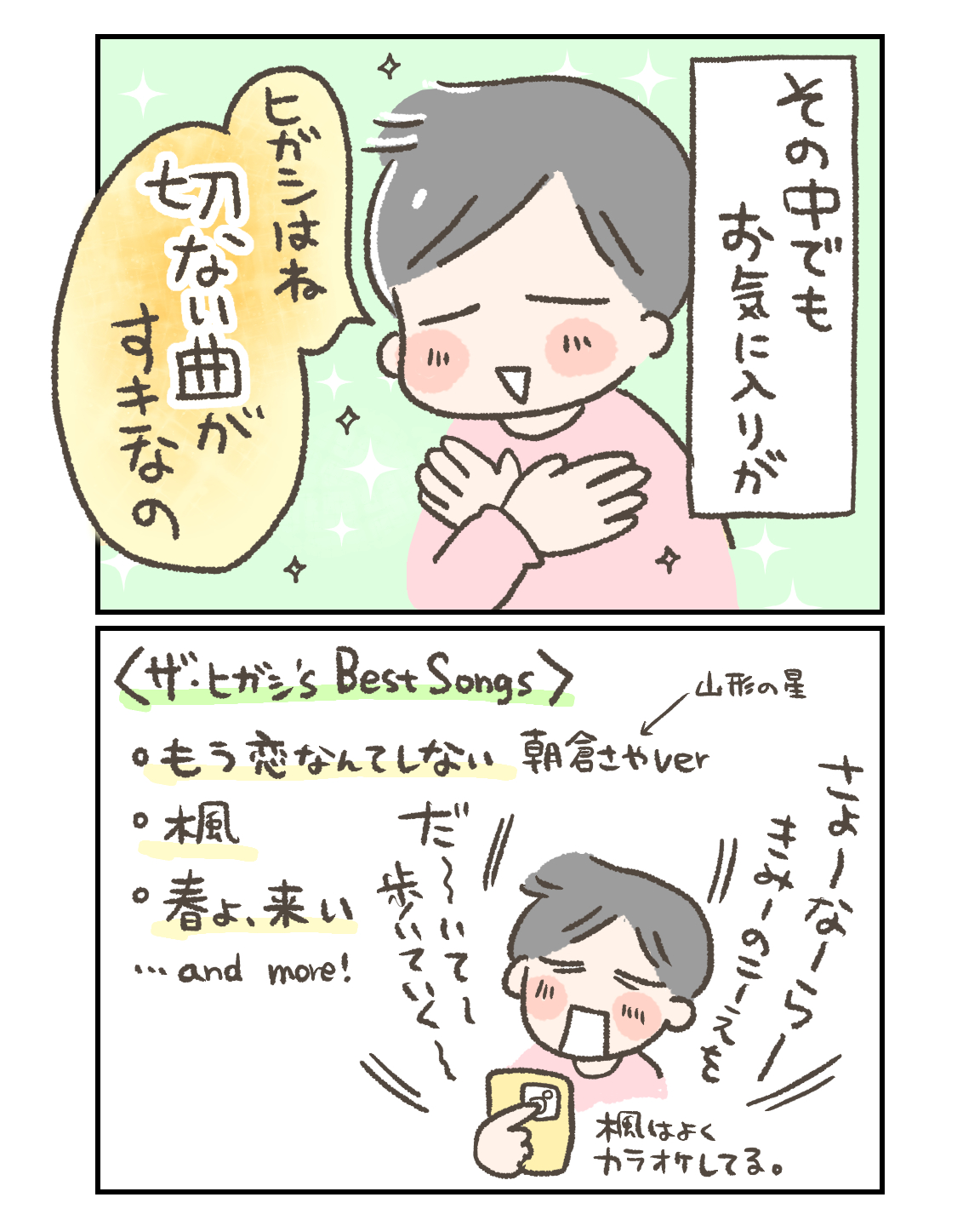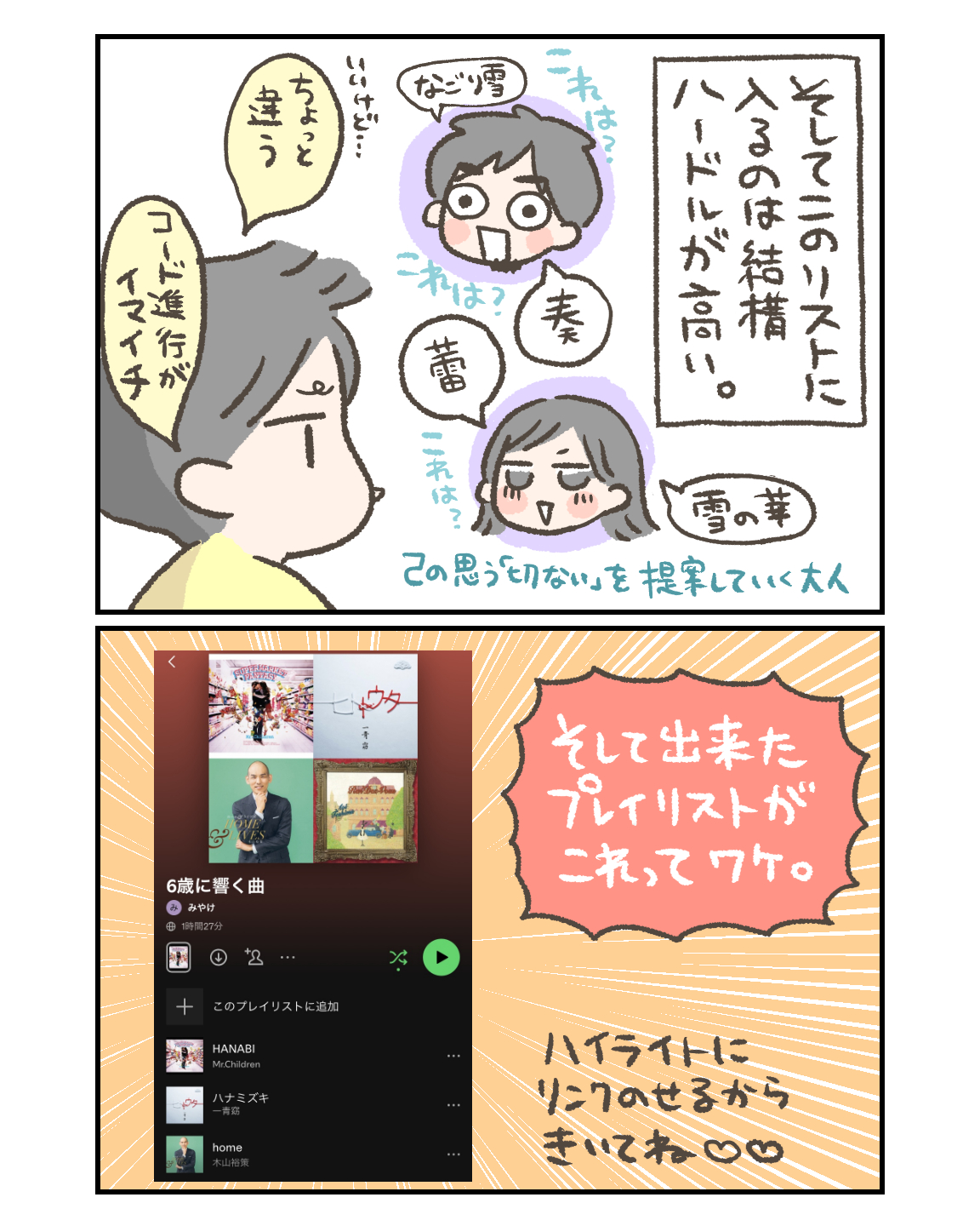 俺らの懐メロ、6歳にも響く 育児・日常漫画 2025.03.072026.01.04 6歳に響く曲 ヒガシくんのお気に入りポイント お気に入りポイントは ・好きなキーであること(F、Gあたりが好き) ・好きなコード進行であること ・歌詞が良いこと ・展開が良いこと とのこと。 そんなプレイリストがこちら 6歳に響く曲 ひっそりと更新中です。切なさと懐かしさを感じてください。